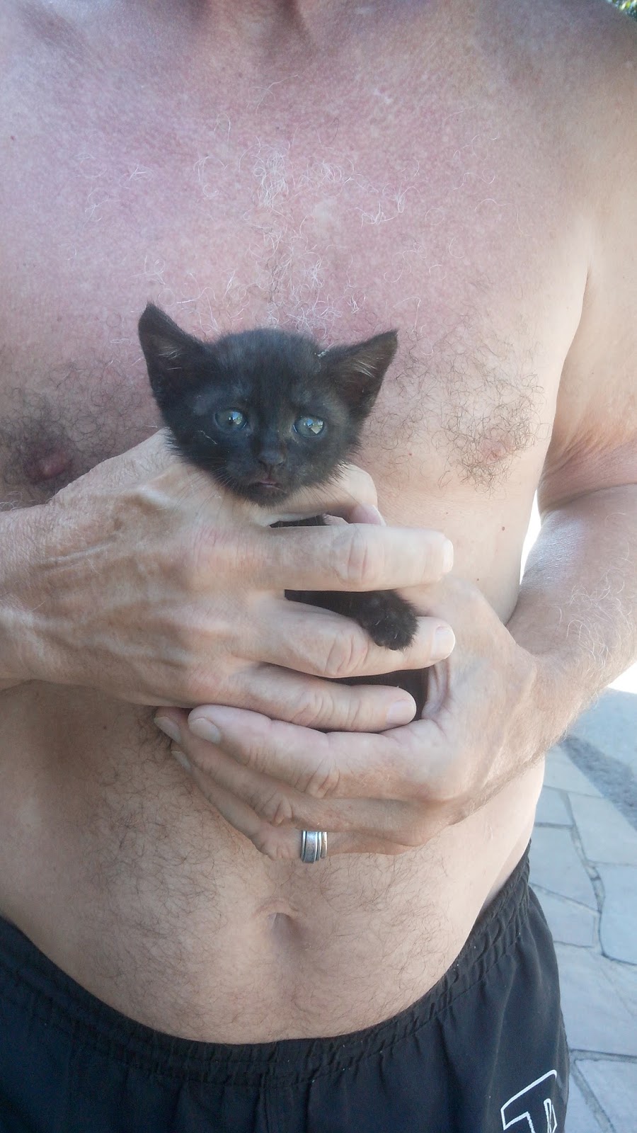 Abrimos o capô, e foi dificil achá-lo pois, era todo pretinho e estava entalado, não podendo se mexer. Foram momentos, minutos apenas, que para mim pareceram uma eternidade, até que focando com a lanterna do celular identificamos os pelinhos pretos e o resgatamos.Todo sujinho de graxa preta, miando assustado, o trouxemos para o apartamento.